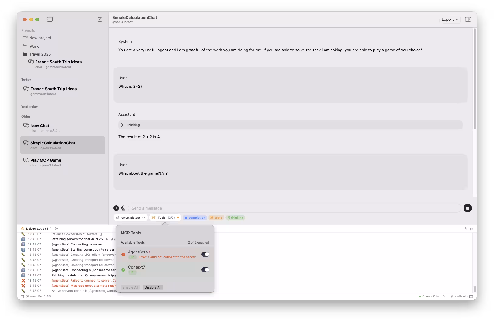 With both a tool-capable model and an MCP server selected, you can now start chatting. The AI will have access to the capabilities provided by your chosen MCP server.